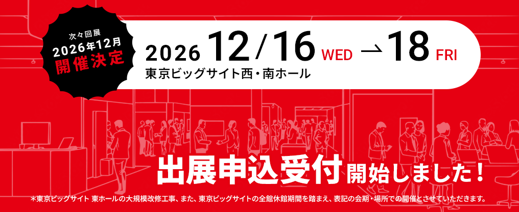 - 2026年12月開催の出展申込受付を開始しました。(2026/12/16(水)~18(金) 東京ビッグサイト 西・南ホール)